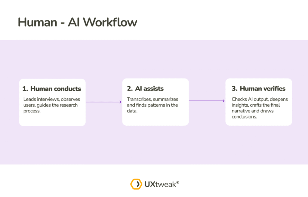A clear workflow pattern is emerging: human researchers lead the work, AI assists with analysis, and humans verify the output before acting on it.