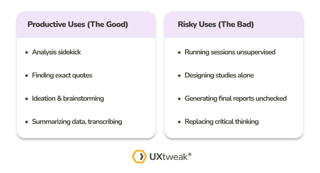 “I don’t use it to design studies, conduct research, analyze data unsupervised, or generate research outputs (like write-ups and recommendations).” – Maria Rosala