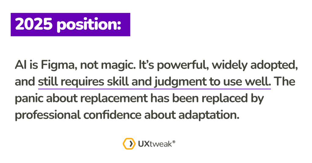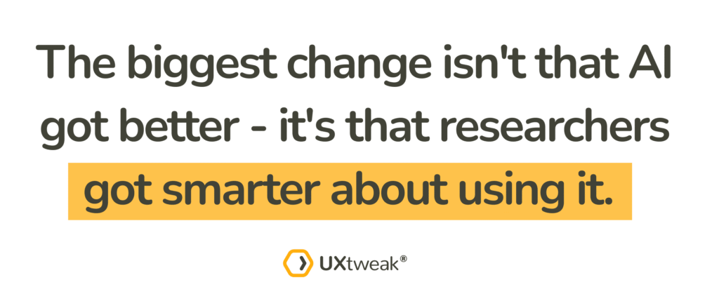 The transformation from 2023 to 2025 reveals a divided field. UX researchers have moved from asking “Will AI replace us?” to “How do we use AI strategically?”