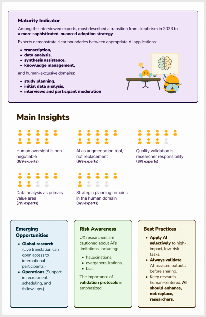 The findings reflect expert views and our interpretations, offering a focused snapshot rather than generalizable conclusions. Despite the small sample size, these qualitative insights from industry leaders provide valuable context for understanding AI’s evolving role in UX research.