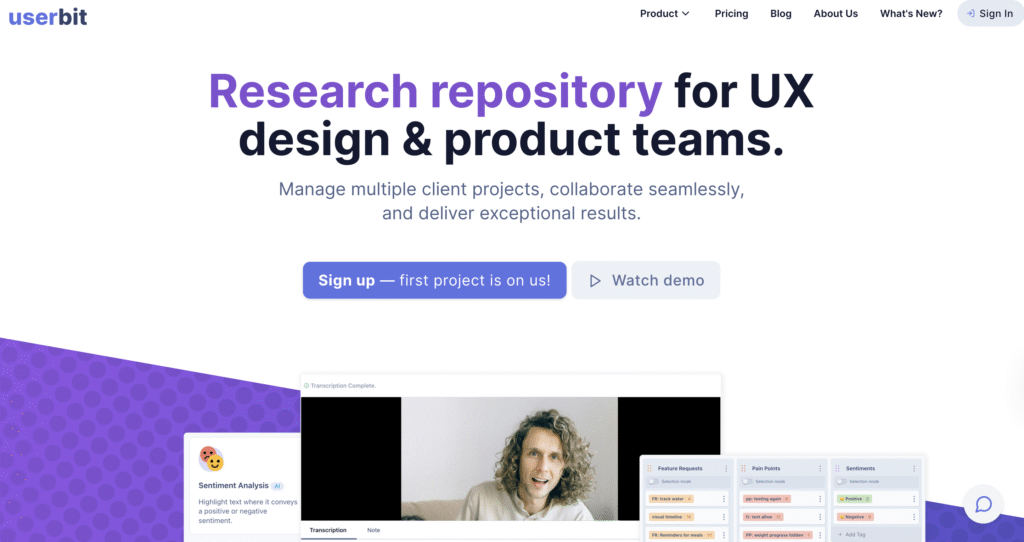 UserBit is a centralized research repository designed to store interviews, surveys, notes, and artifacts in one place. It uses AI to transcribe and tag data, enrich insights, and surface patterns across projects. It can also act as a stakeholder portal by serving curated insights externally.