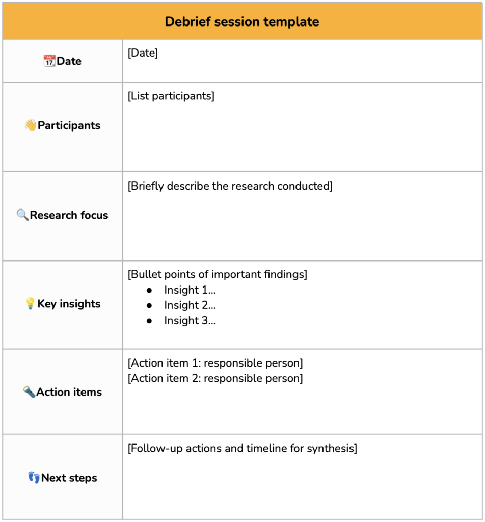 Here is a handy debrief meeting template that you can use for your UX research project to ensure consistency: