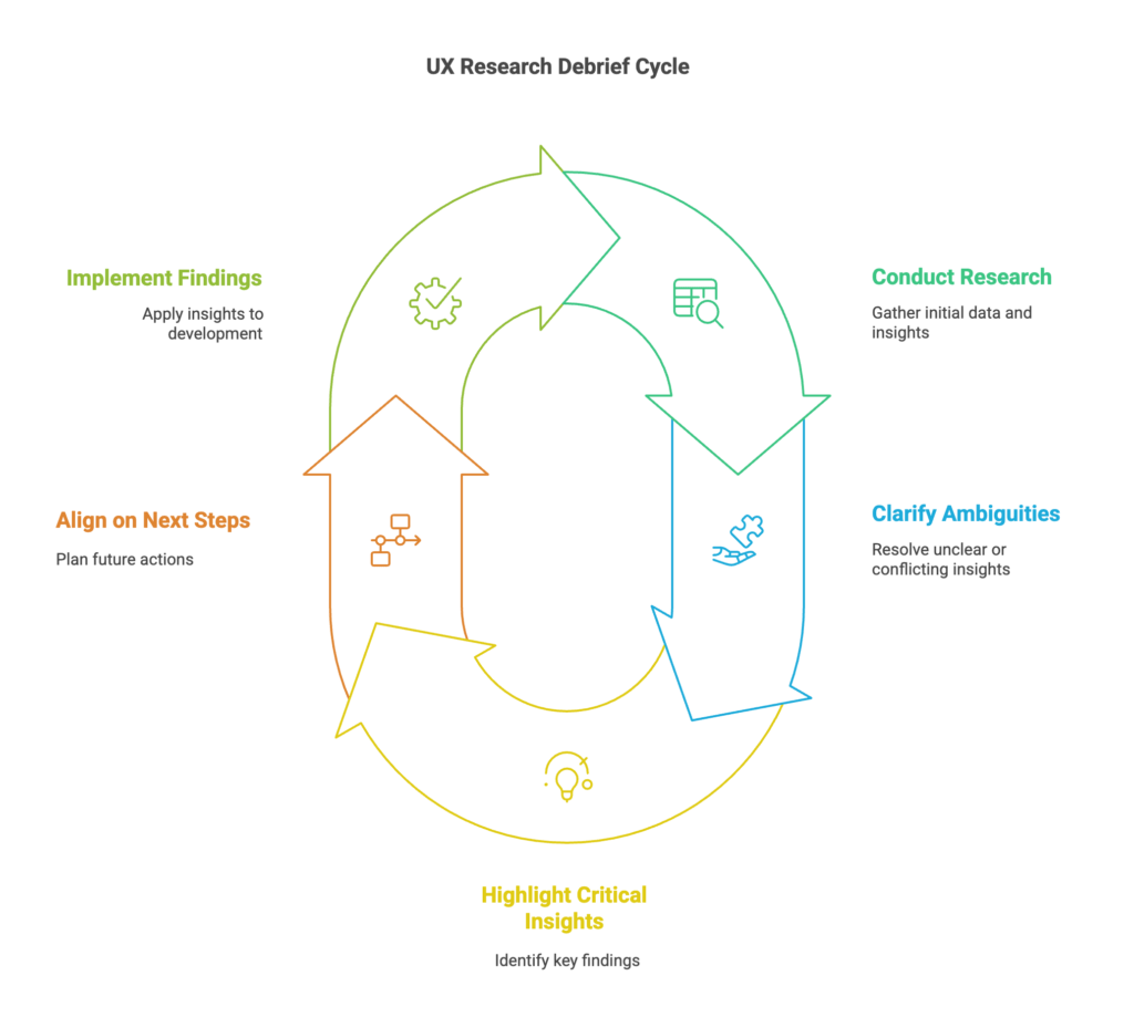 Debrief meetings are an integral part of the UX research process as they allow the UXR team to clarify any ambiguities, highlight any critical insights, and align on the next steps and implementation of the research findings.