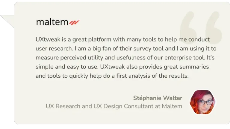 UXtweak goes beyond standard support by offering consulting and audits from our team of skilled UX researchers. Our dedication to quality is reflected in our 5/5 rating on Capterra. Learn more about our UX research consulting services.
