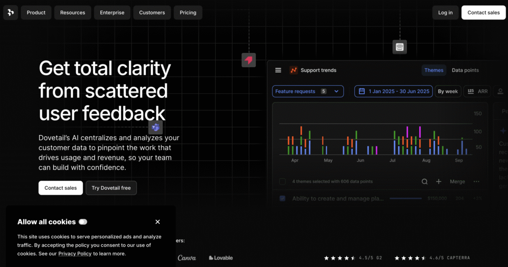 Dovetail offers a free plan with core features available, along with a custom Enterprise plan for larger teams that need advanced controls, security, and scalability.