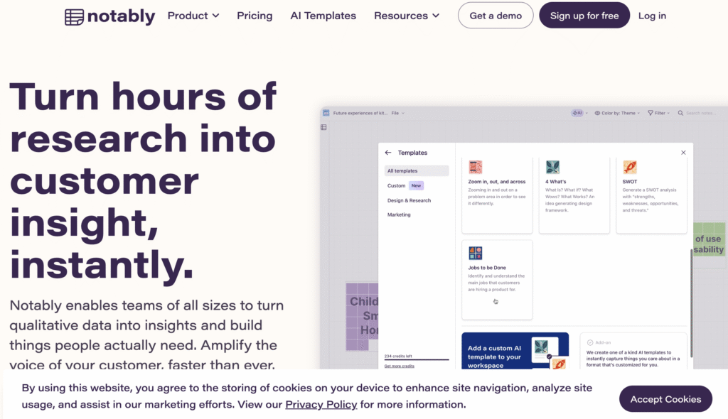 Notably is a collaborative qualitative analysis tool built to support team-based sense-making during research synthesis. Most notably, it emphasizes visual and collaborative workflows that allow teams to tag, cluster, and theme qualitative data together in real time. This makes Notably a strong fit for workshops and group synthesis sessions rather than long-term research repository management.
