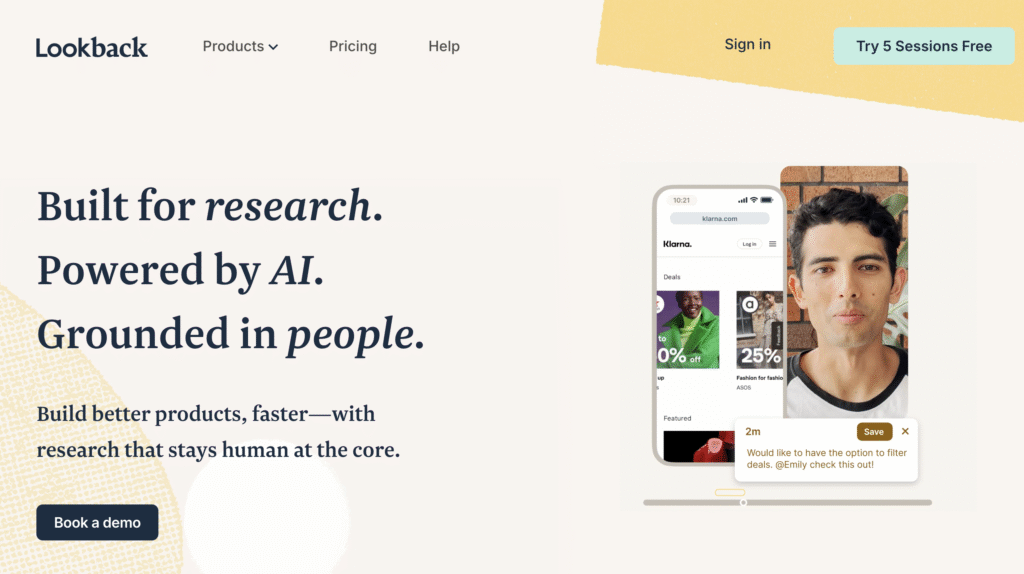 Lookback is a qualitative research platform focused on live interviews, usability testing, and session recording. It allows researchers to observe users in real time, capture highlights during sessions, and collaborate with stakeholders through shared notes and timestamps. Compared to tools like Looppanel that focus heavily on post-session synthesis, Lookback shines earlier in the research process by making live research easier to run and share. It’s particularly useful for teams that want fast feedback loops without complex setup or heavy repository workflows.