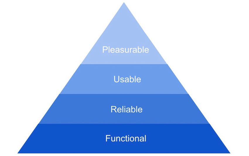This pyramid acts as a user needs model. Just like Maslow’s hierarchy of human needs, you have to cover the essentials first before moving up to high-level expectations.