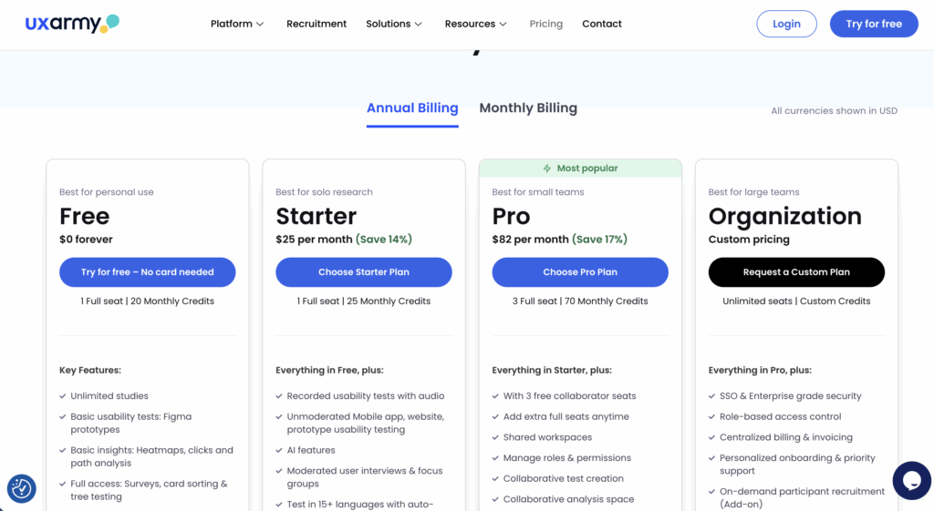 This plan includes all the features from the free tier, plus an extra 5 monthly credits. Additionally, it provides recorded usability tests with audio, unmoderated mobile/website/prototype usability testing, as well as moderated user interviews & focus groups. The Starter plan also provides access to UXArmy’s participant panel.
