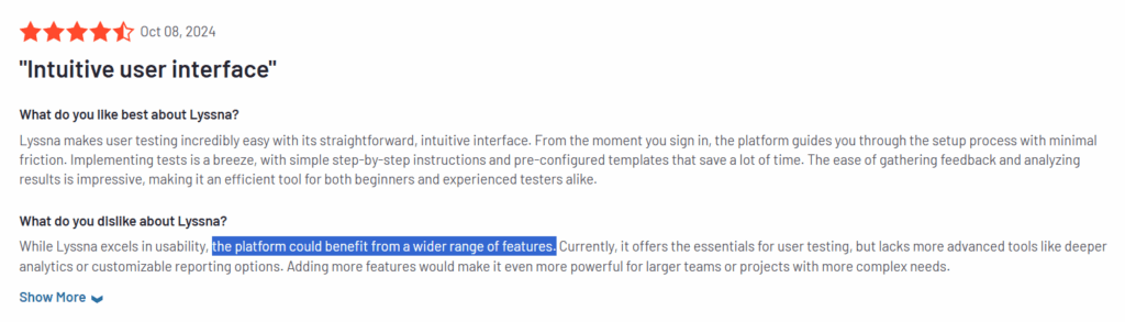 - Limited testing formats: Absence of short, unmoderated testing options like think-aloud tasks. Users suggest that short audio recordings at the end of tests could capture valuable insights.