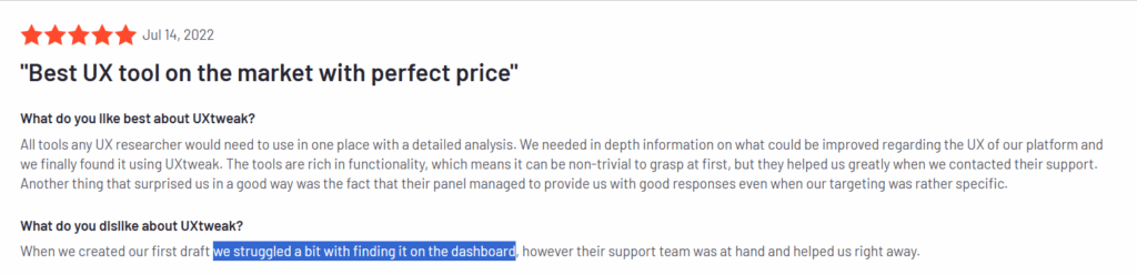 Goes beyond standard support by offering consulting and audits from our team of skilled UX researchers. Our dedication to quality is reflected in our 5/5 rating on Capterra. Learn more about our UX research consulting services.