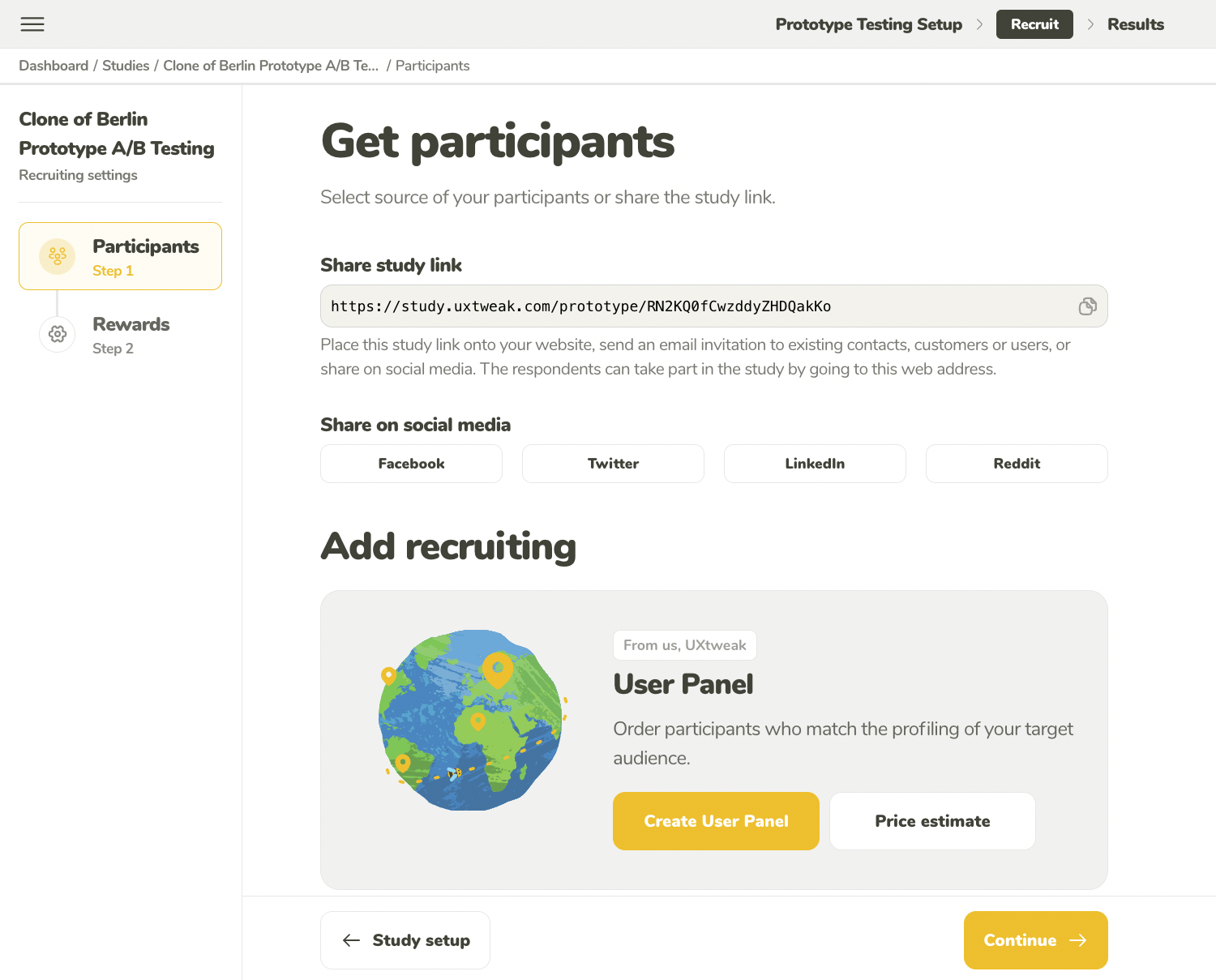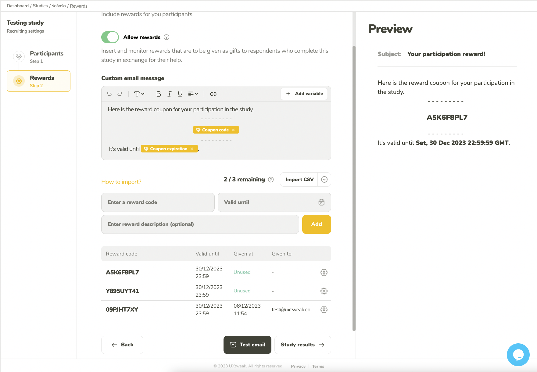 - Revamped study rewards – you may now easily setup rewards (promo codes, gift cards) for your study participants as part of setting up the recruitment